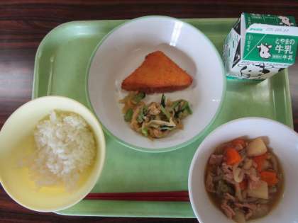 今日の給食 公開日 2023/10/04 更新日 2023/10/04 今日の興南中 10月4日(水)の献立は、 ごはん、牛乳、はんぺんフライ、はりはり和え、肉じゃが です。 肉じゃがが美味しい季節になりました。はんぺんは、フライにすると主役級のおかずです。 10月もりつけ表はこちらから。