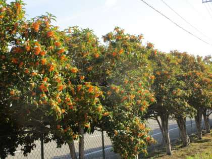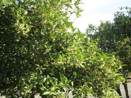 生徒玄関前のたくさんのキンモクセイのなかに、ギンモクセイの白い花も咲いています。