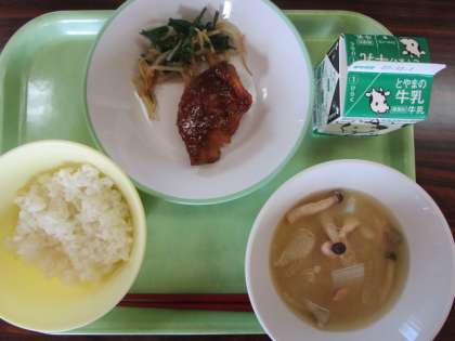 ごはん、牛乳、赤魚の照り焼き、香味和え、いものこ汁