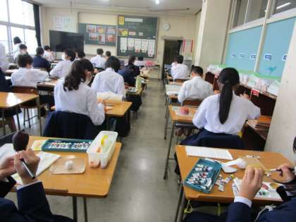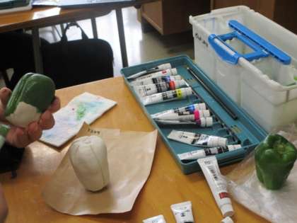 1年3組 美術の授業 公開日 2023/10/27 更新日 2023/10/27 1年生 5限の授業の様子です。 1年生の美術では、紙粘土を使って、野菜や果物を制作しています。形や色を工夫して、本物そっくりに仕上がっていきます。上手です!
