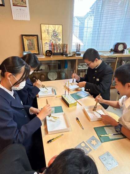 金箔貼り体験をしています!金箔の薄さに驚きながら、慎重かつ丁寧に作業しています。