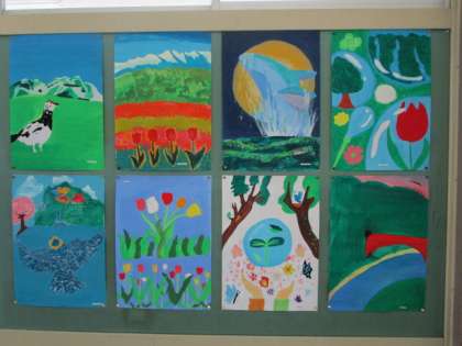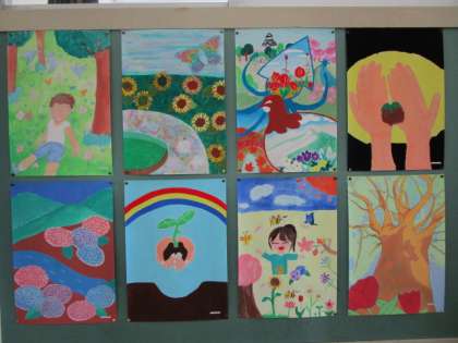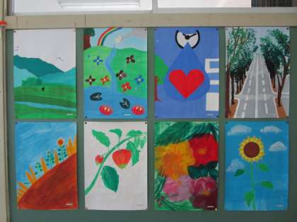 美術室前の掲示板には、2年1組の「花と緑のポスター」の作品が掲示されました。