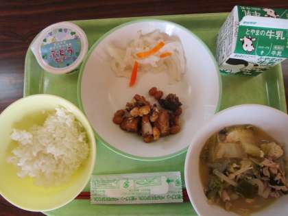 ごはん、牛乳、魚と大豆のえごまからめ、おすわい、とやまのみそ野菜なべ、海洋深層水ゼリー