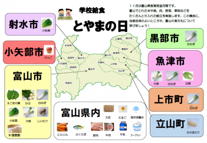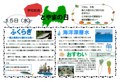 「今日の富山県産の食べ物は、ふくらぎ、大豆、えごまの葉、だいこん、にんじん、豚肉、生しいたけ、白菜、えのき、小松菜、ねぎ、海洋深層水、米粉、牛乳です。
