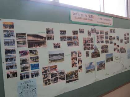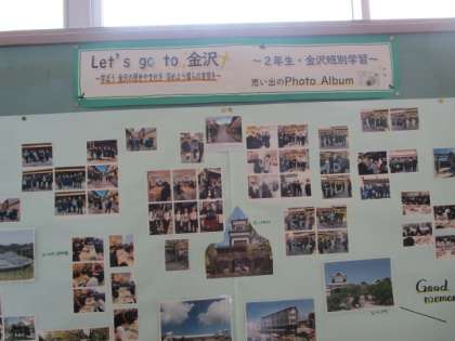 2年生の掲示板や廊下には、金沢校外学習の思い出の写真や、学習の成果が掲示されています。