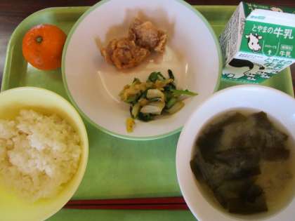 ごはん、牛乳、鶏肉のから揚げ、小松菜ひたし、じゃがいものみそ汁、みかん