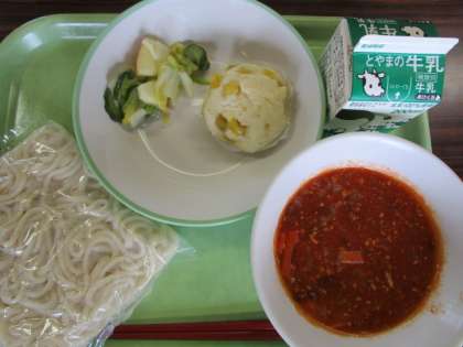 今日の給食 公開日 2023/12/05 更新日 2023/12/05 今日の興南中 12月5日(火)の献立は、 ソフト麺、牛乳、ソフト麺のミートソースかけ、蒸しパン、白菜とりんごのサラダ です。 ソフト麺と蒸しパンのセットも楽しみなメニューの一つです。 12月献立表はこちらから。