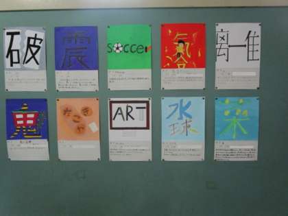 1−1デザイン作品 公開日 2023/12/15 更新日 2023/12/15 1年生 美術室前の掲示板です。 1年1組のデザイン作品「文字で楽しく伝える」が展示されました。 文字からイメージをふくらませた作品が並んでいます。