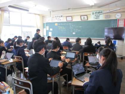 2年生の技術・家庭科(技術分野)では、来年度の修学旅行で訪問する広島や関西の紹介プレゼンテーションの資料を作成する課題に取り組みます。ワクワする学習です。