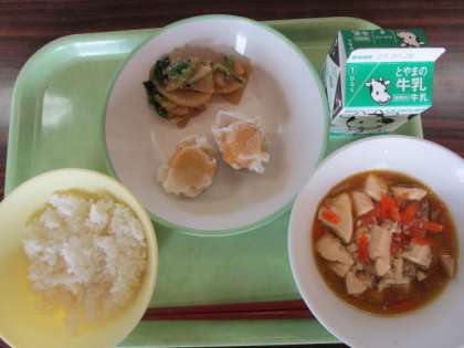 ごはん、牛乳、にんじんシューマイ、大根ナムル、マーボー豆腐
