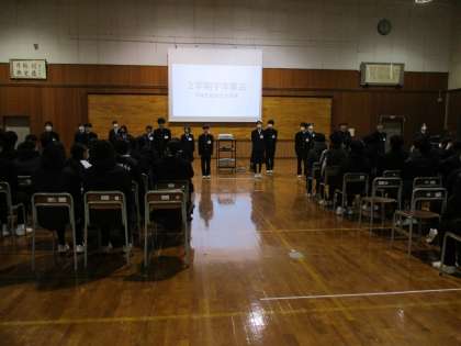 学年集会 公開日 2023/12/21 更新日 2023/12/21 1年生 12月21日(木) 4限 今日の学年集会では学年生徒会が「先輩になるためにプロジェクト」の提案をしました。 1つ目は、課題実践計画キャンペーン 2つ目は、掃除マジでやるweek 3つ目は、リベンジテスト 4つ目は、学年レクリエーション 1年生全員一丸となって頑張りましょう。 その後、先生方から生活や学習についての話がありました。