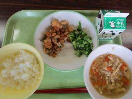 ごはん、牛乳、魚と大豆のねぎソースからめ、ゆでブロッコリー、中華かき玉汁