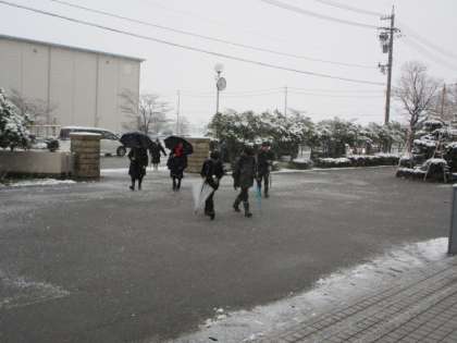2学期の最終日は、雪が降る朝です。途中から、予報通り強く降ってきました。
