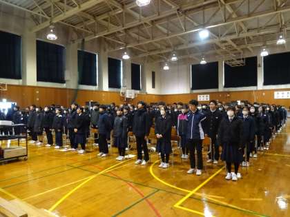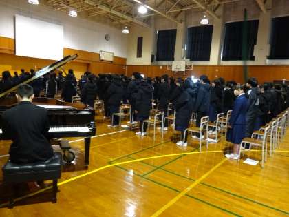 寒い中での式ではありましたが、今回から2年生にバトンタッチされた伴奏にのって、全校生徒で高らかに校歌を歌いました。