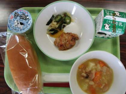 今日の給食 公開日 2024/01/15 更新日 2024/01/15 今日の興南中 1月15日(月)の献立は、 米粉コッペパン、牛乳、照焼きチキン、海藻サラダ、豆ときのこのスープ煮、ヨーグルト です。 豆ときのこのスープ煮は、じゃがいもやウインナーもたっぷり入ってポトフ風、パンに合います。 1月もりつけ表はこちらから。