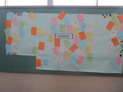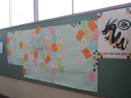 2年生 一文字入魂! 公開日 2024/01/15 更新日 2024/01/15 2年生 2年生の掲示板の「一文字入魂」です。 「勉」「努」「進」「希」「挑」「楽」・・・ 2年生の2024年にかける思いが一文字に込められています。
