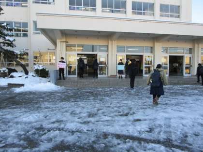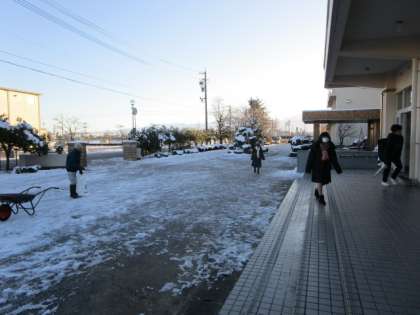 おはようございます!1月17日(水) 公開日 2024/01/17 更新日 2024/01/17 今日の興南中 太陽の光がまぶしい朝ですが、校舎の陰になる生徒玄関前は、昨日からの雪が凍結しています。融雪剤がまかれたところを、一歩一歩、足元を確認しながら登校しました。