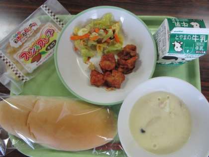 コッペパン、牛乳、魚のアングレス、にんじんと豆のラペ、鶏肉のフリカッセ、ショコラクレープ