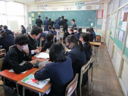 2年生 授業の様子 公開日 2024/01/23 更新日 2024/01/23 2年生 上:2−1 理科 「電気代が高いのはどれ?」 蛍光灯、電子レンジ等、それぞれの使用条件から電気の使用量を求め、高い順番を予想しています。 中:2−2 国語 文法「助動詞について詳しく理解しよう。」 下:2−3 保健体育 柔道 実技テストの前に、ペアで真剣に練習しています。