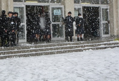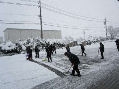 今日の除雪当番は1年2組です。雪が降る中、登校玄関前と給食の車が入るスペースを除雪してくれました。ありがとう!