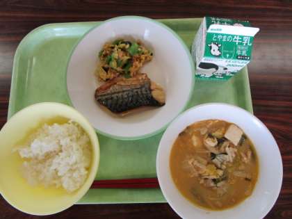 ごはん、牛乳、さばの塩焼き、ねばーる納豆和え、全集中ごまキムチ鍋