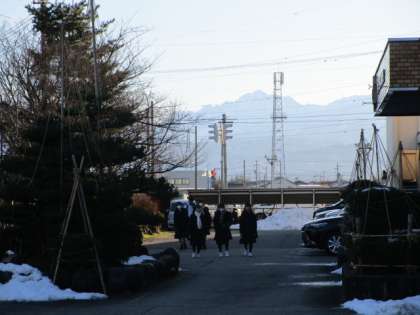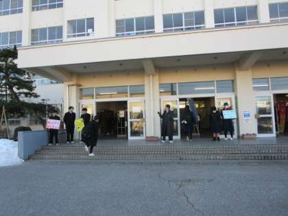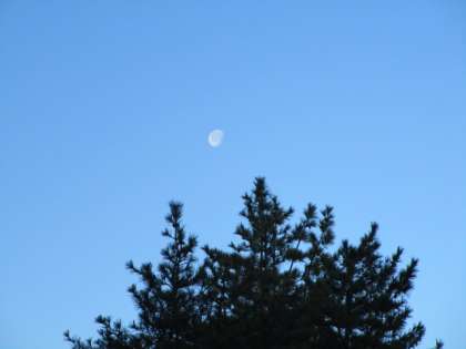 快晴の朝、青空に白い月が映えます。生徒玄関には、今日も元気な挨拶の声が広がりました。気持ちのよい1日の始まりです。