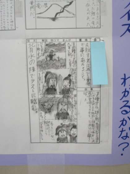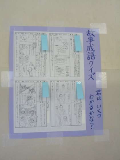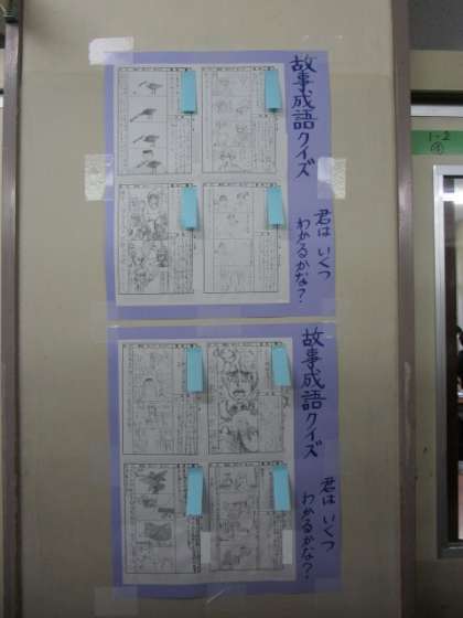 1年生の廊下には、国語の授業で考えた「故事成語クイズ」が掲示されています。四コマ漫画にも力が入っています。