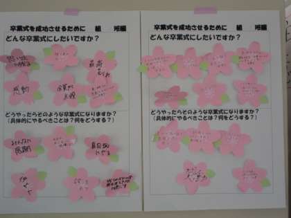 3年生 卒業に向けて 公開日 2024/02/08 更新日 2024/02/08 今日の興南中 3年生は、入試に向けての準備と同時に、卒業に向けての準備を進めています。「どんな卒業式にしたいか」「どうしたらそうなるか(具体的に何をすればよいか)」を考えました。一日一日を大切に、みんなで考えたことを積み重ねていきましょう。