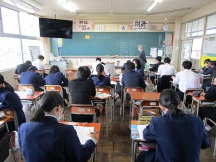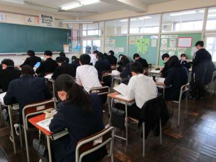 3年生 授業の様子 公開日 2024/02/19 更新日 2024/02/19 3年生 5限の授業です。 上:3−1 音楽 日本の伝統芸能「能」について学んでいます。 中:3−2 保健体育 明日からの評価に向けての学習です。 下:3−3 社会 スイスコース(1人)、日英同盟コース(2人)、USMCAコース(3人)・・・とコースを選んで、夢に向かっ学んでいます。コース名も勉強になります。