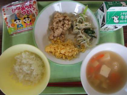 ごはん、牛乳、そぼろ丼(鶏そぼろ、炒り卵)、なばなひたし、白玉汁、ひなあられ