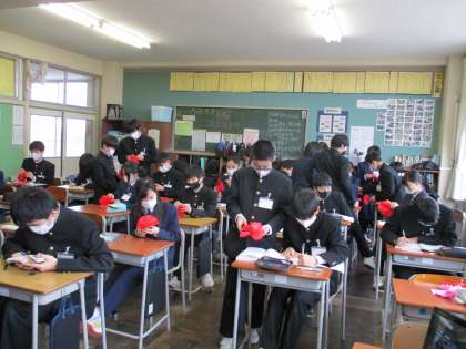 今日の1年生 公開日 2024/03/07 更新日 2024/03/07 1年生 3月6日(水) 3限 今日は来年度に向けてのリーダーアンケートをしました。何人もの人が積極的にリーダーに立候補してくれて、頼もしい限りです。 その後、卒業に向けて楽しくお花作りをしました。 (写真 上:1年1組) (写真 中:1年2組) (写真 下:1年3組)