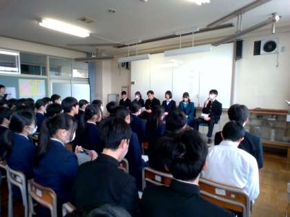 (写真 上:先輩たちとの対面 下:高校の紹介をする先輩)