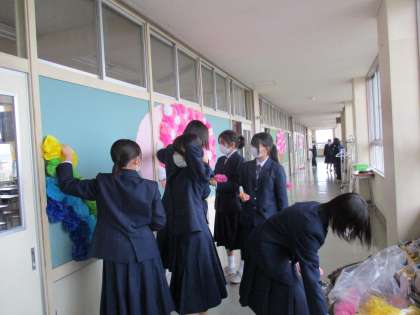 1年生飾り付け 公開日 2024/03/08 更新日 2024/03/08 1年生 3月7日(木) 今日の放課後に飾り付け担当者が集まって、卒業に向けて飾り付けを行いました。 教室担当は花束作りを、廊下担当は桜や虹作りをしました。 桜はいよいよ満開になりました。