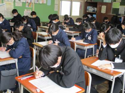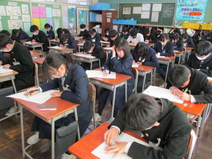 1年生リベンジテスト 公開日 2024/03/11 更新日 2024/03/11 1年生 3月11日(月) 5限 今日は学年生徒会主催で学年末テストのリベンジテストがありました。 この日のために、数日前から、学年生徒会の生徒は、各教科の先生に出題してほしい問題を聞き、切り貼り等をしてテストを作成しました。 各クラス、真剣に取り組んでいます。 1年生の皆さん、手応えはありましたか? (写真 上:1年1組) (写真 中:1年2組) (写真 下:1年3組)