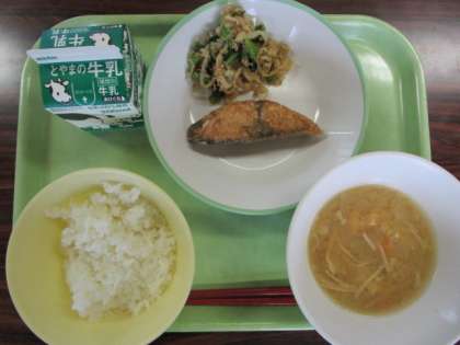 ごはん、牛乳、ふくらぎのかば焼き、はりはり和え、五目汁