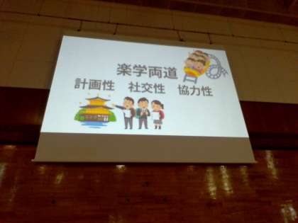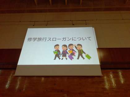 2年生・修学旅行に向けて(3月15日)・その1 公開日 2024/03/15 更新日 2024/03/15 2年生 3月15日(金) 5限 2年生は「修学旅行」に向けた学年総会を開きました。 以前、実施したアンケートに基づき、学年生徒会が話し合った修学旅行のスローガンと3つの行動目標が提案され、生徒の賛成多数により承認を受けました。 スローガンは「楽学両道」 修学旅行を学年全員で体験することで「楽しむ」、日本の伝統や文化、平和に関することを「学ぶ」という意味です。