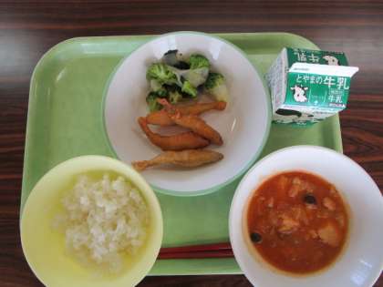 ごはん、牛乳、わかさぎのフリッター、こんにゃくサラダ、鶏肉のトマト煮