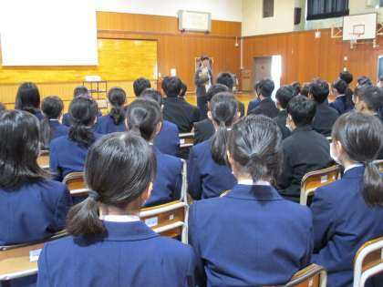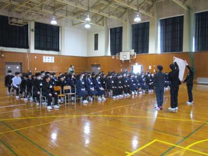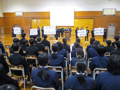 2年生・学年集会 公開日 2024/04/08 更新日 2024/04/08 2年生 4月8日(月) 5限 今日の学年集会では、まず初めに旧学年生徒会から今年度の学年目標の発表がありました。 今年度の学年目標は「自主独立→自律自存」です。 1年後、みんながこの目標を達成できたら大成功です。 その後、学年の先生方からの自己紹介、学習や生活についてのお話がありました。 (写真 上:旧学年生徒会による学年目標の発表) (写真 中、下:しっかり話を聴く2年生)