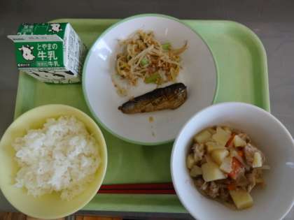 今日の献立は、ごはん、牛乳、いわしの梅煮、いり大豆和え、肉じゃがでした。