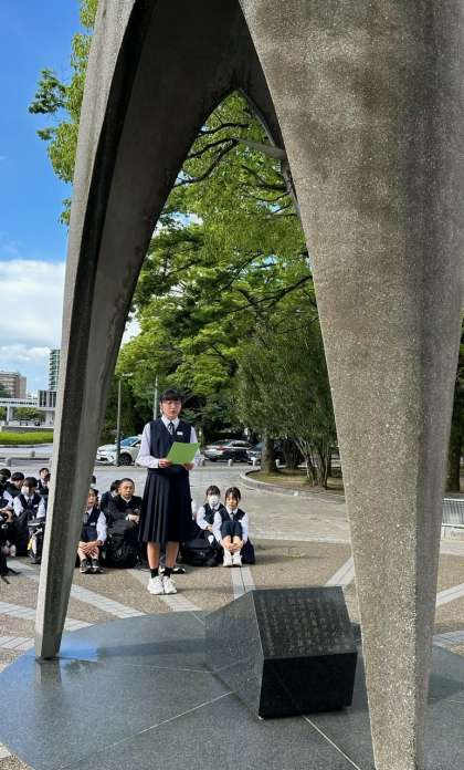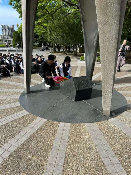原爆の子の像の前で平和セレモニーを行っています。平和への誓いを胸にこれからも平和学習を続けたいと思います。