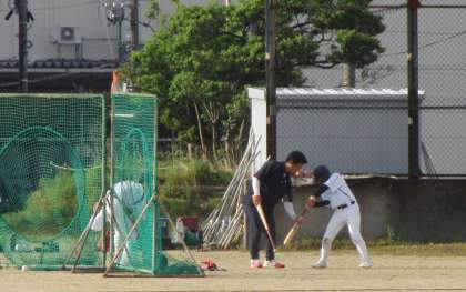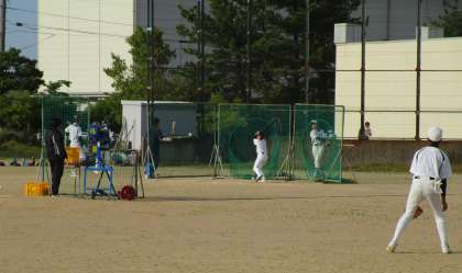 バッティング練習です。先生に見てもらったり、マシーンからの球打ちをしたり、集中しています。