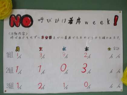 呼びかけをしないでも自分たちで時間を見て3分前着席できるかどうかが試されています。