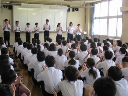 2年生・体育大会関係 公開日 2024/06/28 更新日 2024/06/28 2年生 6月27日(木) 6限 今日の6限は、体育大会実行委員・団リーダー立ち会い演説会&投票の日でした。 立候補した生徒たちは、演説だけでなく、司会進行も行いました。 彼らは緊張しながらも、学年の皆の前で自分の思い・決意表明等を述べました。 その後、各団に分かれてクロムブックで投票をしました。