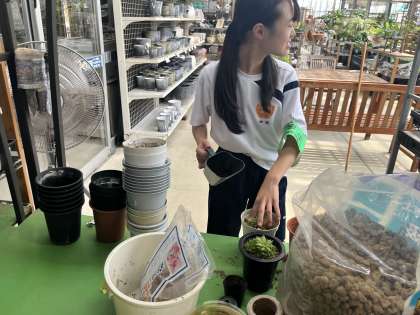 「社会に学ぶ『14歳の挑戦』」活動報告 グリーンマーケット 公開日 2024/07/04 更新日 2024/07/04 14歳の挑戦 鉢植えをつくったり、傷んだ部分を取り除く作業をしていました。3人とも「楽しい」と話していました!あと2日、暑さに負けず頑張ってください!
