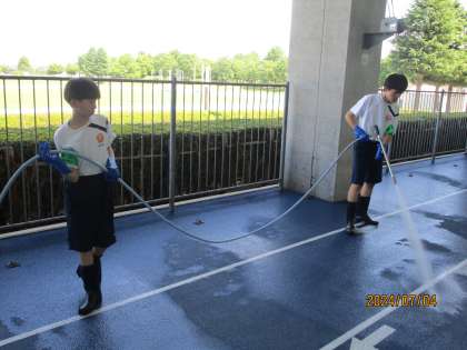 「社会に学ぶ『14歳の挑戦』」活動報告 富山県総合運動公園 公開日 2024/07/04 更新日 2024/07/04 14歳の挑戦 今日は雨天走路の清掃を頑張って行いました。鳥の糞やほこりを洗い流しています。