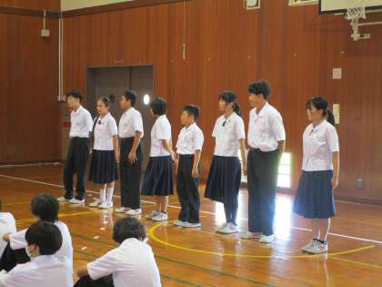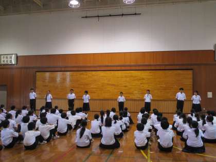 1年生 体育大会に向けての学年集会 公開日 2024/07/05 更新日 2024/07/05 1年生 体育大会の、団リーダーのお披露目となる学年集会を行いました。各団のリーダーが、皆の前で自己紹介を行い、体育大会に向けて一層気が引き締まりました。いい体育大会にしたいという思いが伝わってくる、素晴らしい演説でした。 その後、先生方から体育大会への思いが語られました。素敵な体育大会になるよう、皆で頑張りましょう!