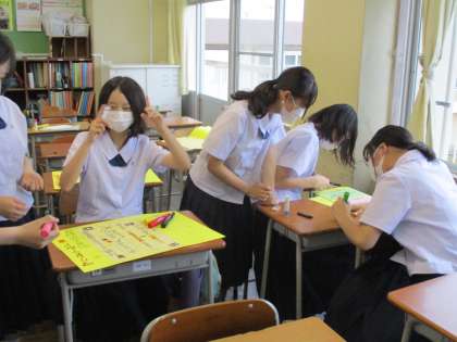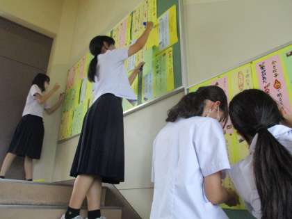 社会に学ぶ「14歳の挑戦」短歌掲示 公開日 2024/07/17 更新日 2024/07/17 2年生 7月16日(火) 放課後 社会に学ぶ「14歳の挑戦」の事業所の班長たちが集まって、国語の授業で作った「14歳の挑戦」で学んだこと・感じたことを書いた短歌を事業所別に貼りました。 階段掲示板や3階廊下に掲示してあります。 懇談会の待ち時間や懇談会後等に、ゆっくりご覧ください。