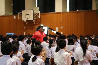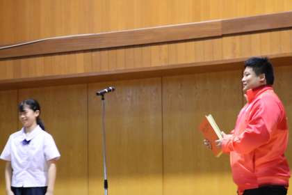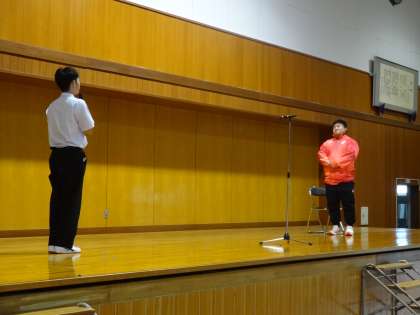 村上英士朗選手壮行会1 公開日 2024/07/17 更新日 2024/07/17 今日の興南中 7月17日(水) 本日、パリ五輪ウエイトリフティング競技日本代表の村上英士朗選手が本校を訪問してくださいました。 村上選手は本校の卒業生で、在学時に生徒会長を務めた、興南中生の大先輩です。 壮行会では、部の後輩である柔道部の部長が激励の言葉を述べ、全校生徒が心を込めて書いた応援メッセージの寄せ書きを生徒会の代表から贈りました。