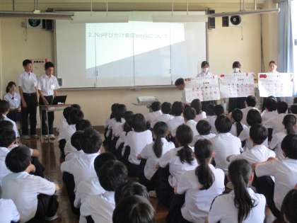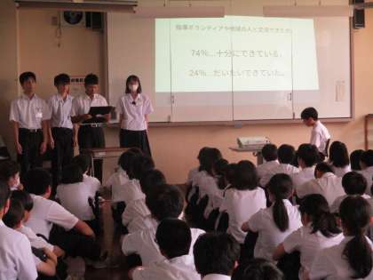 今日の学年集会では、まず初めに学年生徒会から1学期の振り返りの発表がありました。