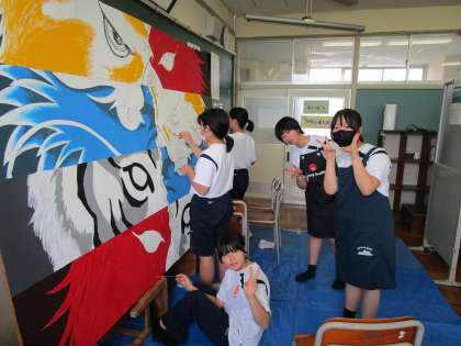 夏季休業中に、3年生デコレーション係の生徒たちが、2学期の体育大会を飾る「デコレーション」を制作しています。メンバーはとても生き生きして描いています。素敵な作品、楽しみにしていますね。